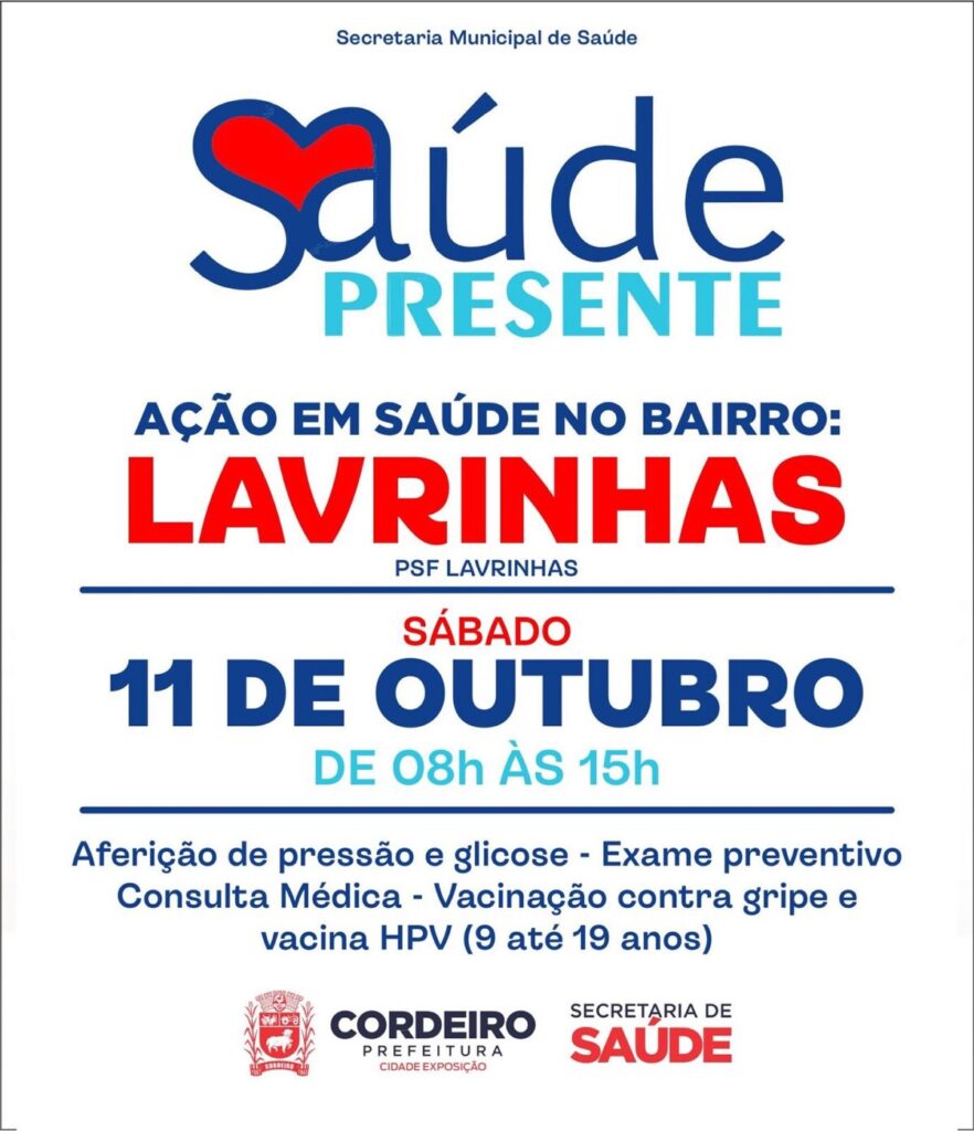 Local: PSF Lavrinhas Dia: 11/10/25 Horário: 8h às 15h. Serviços oferecidos: Exame Preventivo Consulta Médica Aferição de pressão arterial e glicose Vacinação contra a Gripe Vacinação contra HPV (público alvo: 9 a 19 anos)
