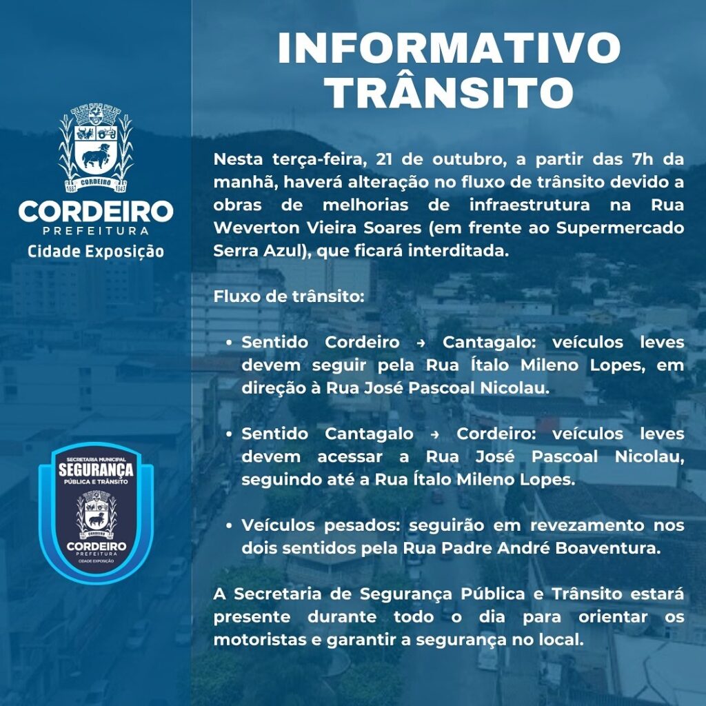INFORMATIVO TRÂNSITO Nesta terça-feira, 21 de outubro, a partir das 7h da manhã, haverá alteração no fluxo de trânsito devido a obras de melhoria de infraestrutura na Rua Weverton Vieira Soares (em frente ao Supermercado Serra Azul), que ficará interditada. Fluxo de trânsito: Sentido Cordeiro → Cantagalo: veículos leves devem seguir pela Rua Ítalo Mileno […]