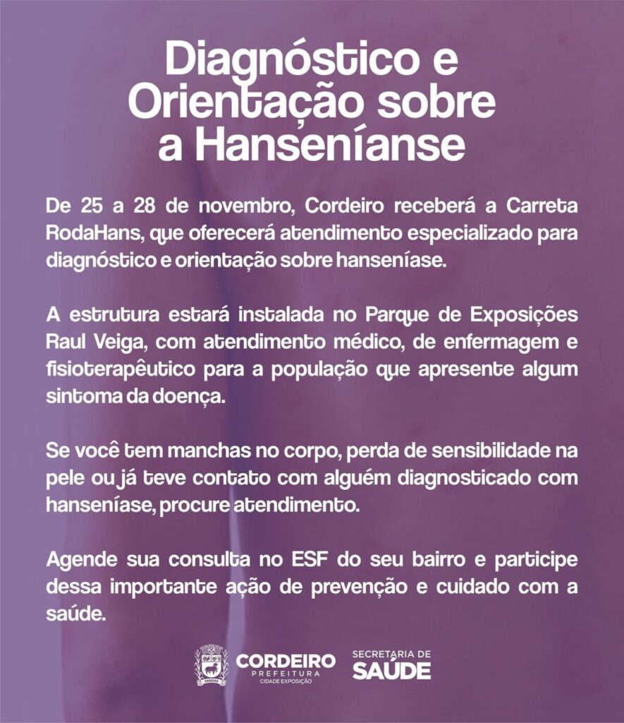 De 25 a 28 de novembro, Cordeiro receberá a Carreta RodaHans, que oferecerá atendimento especializado para diagnóstico e orientação sobre hanseníase. A estrutura estará instalada no Parque de Exposições Raul Veiga, com atendimento médico, de enfermagem e fisioterapêutico para a população que apresente algum sintoma da doença. Se você tem manchas no corpo, perda de […]