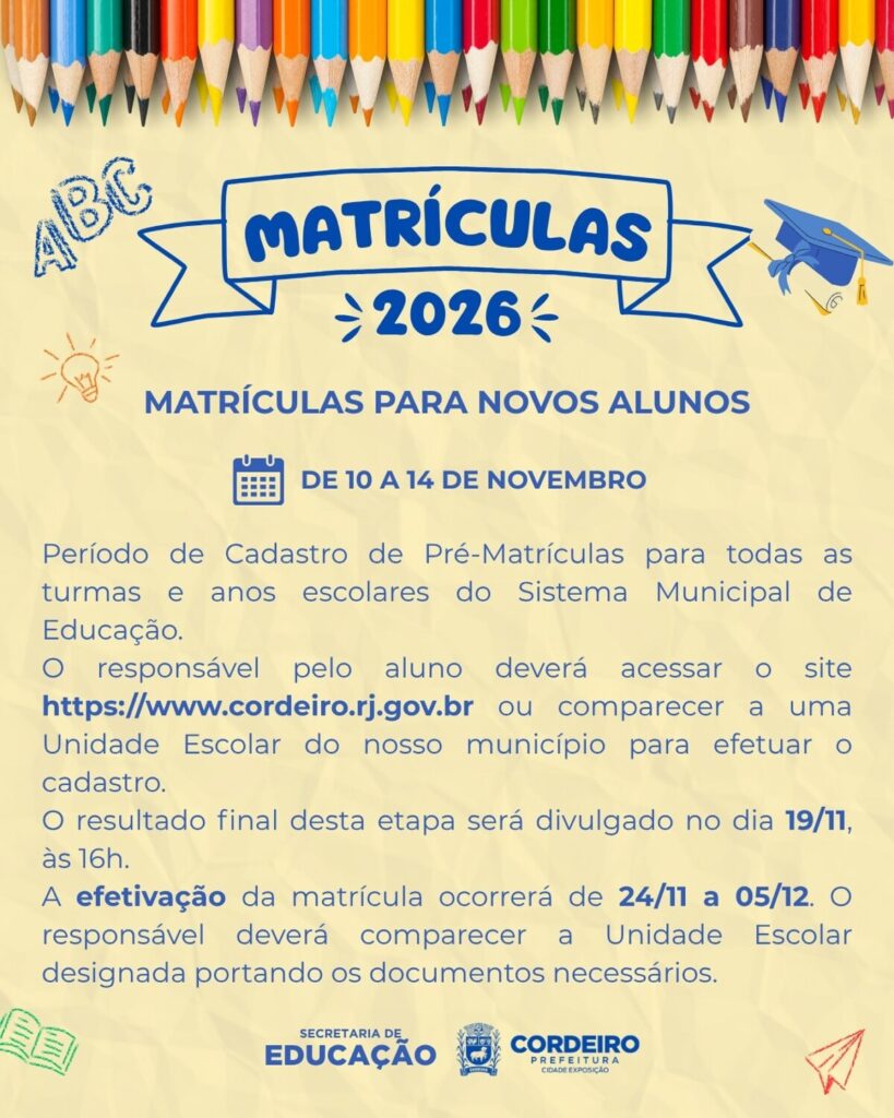 Período de 10 a 14 de novembro Período de Cadastro de Pré-Matrículas para todas as turmas e anos escolares do Sistema Municipal de Educação. O responsável pelo aluno deverá acessar o site ‘https://www.cordeiro.rj.gov.br’ ou comparecer a uma Unidade Escolar do nosso município para efetuar o cadastro. O resultado final desta etapa será divulgado no dia […]