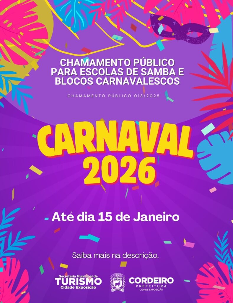 Está aberto o Edital de Chamamento Público Nº 013/2025 da Secretaria Municipal de Turismo para seleção de Agremiações Carnavalescas (ESCOLAS DE SAMBA E BLOCOS CARNAVALESCOS) para o Carnaval 2026. O objeto deste Chamamento Público é Seleção de Agremiações Carnavalescas (Escolas de Samba e Blocos Carnavalescos) para realização de apresentações artísticas durante Desfile na Avenida Raul […]