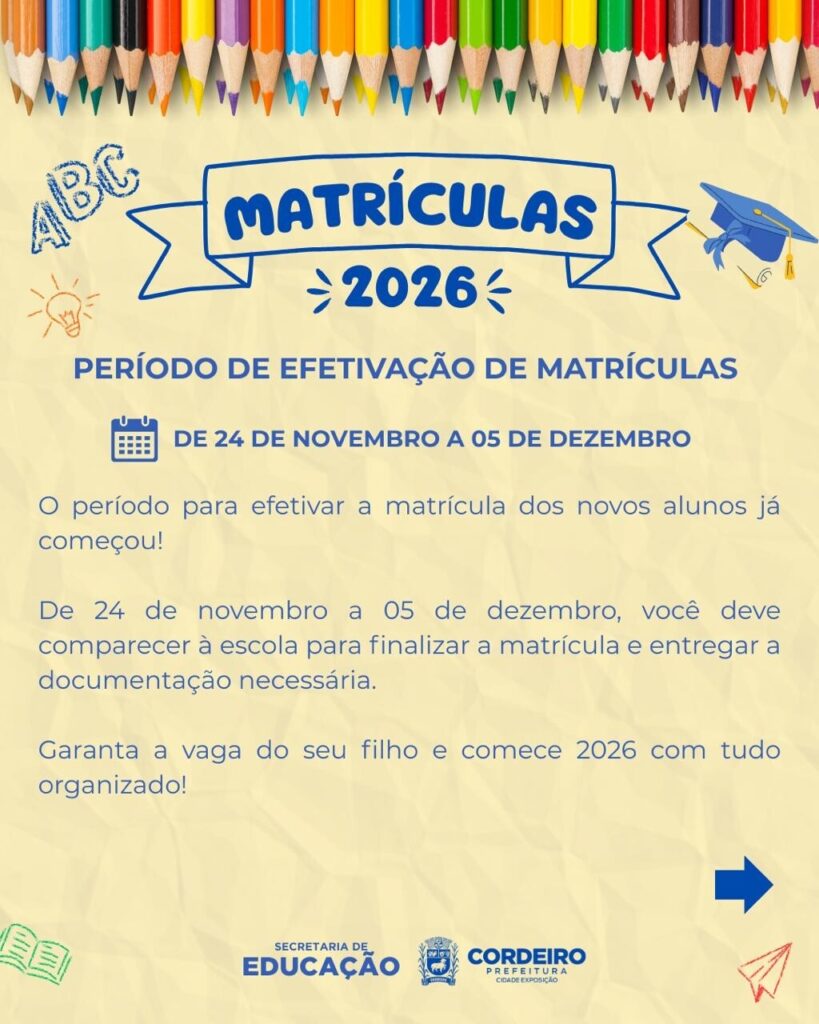 Atenção! O período para efetivar a matrícula dos novos alunos já começou! De 24 de novembro a 05 de dezembro, você deve comparecer à escola para finalizar a matrícula e entregar a documentação necessária. Garanta a vaga do seu filho e comece 2026 com tudo organizado! Documentos necessários: I – Cópia da Certidão de Nascimento; […]