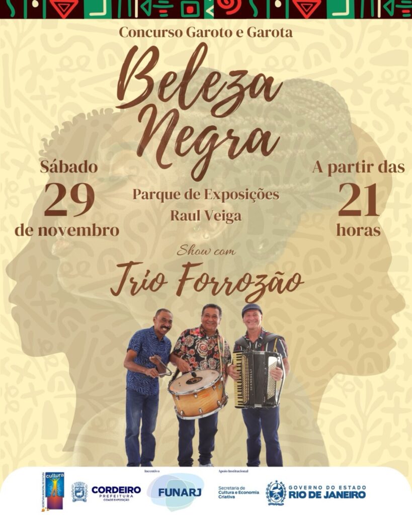 DESFILE BELEZA NEGRA 2025 Neste sábado, 29 de novembro, acontece o tradicional Desfile Beleza Negra, a partir das 21h, no Parque de Exposições Raul Veiga. O evento celebra a beleza, a diversidade e promove a igualdade e o respeito entre todos. Após o desfile, haverá show com Trio Forrozão. Não fique de fora. Venha prestigiar!