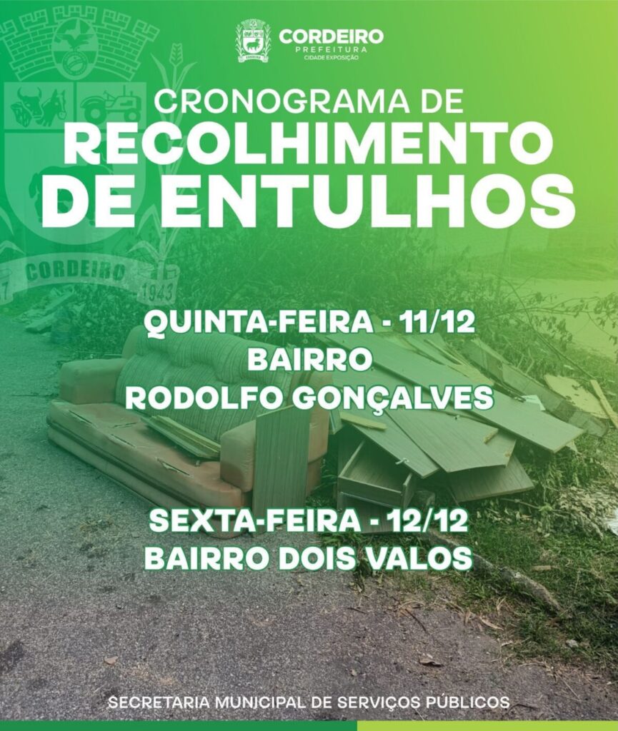 A Prefeitura de Cordeiro, através da Secretaria de Serviços Públicos, informa à população o cronograma para o recolhimento de entulhos. 11 de dezembro – Rodolfo Gonçalves 12 de dezembro – Dois Vallos Solicitamos a colaboração de todos para que os entulhos sejam organizados e dispostos nos locais apropriados com antecedência, garantindo a eficiência do serviço […]