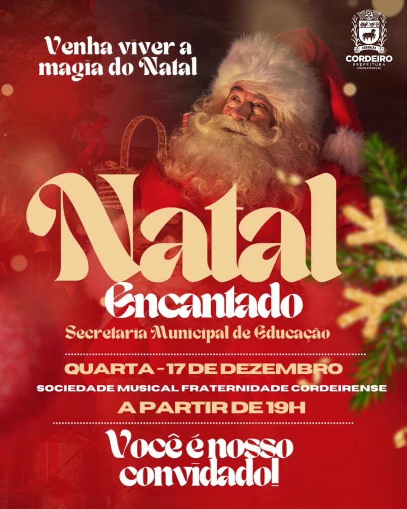 A Prefeitura de Cordeiro, por meio da Secretaria de Educação, apresenta o Natal Encantado, um momento especial preparado com dedicação para celebrar essa época do ano. Venha se divertir e se encantar com as apresentações dos nossos alunos. Dia 17 de dezembro Horário: 19h Local: Sede da Sociedade Musical Fraternidade Cordeirense