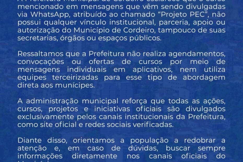 NOTA OFICIAL A Prefeitura Municipal de Cordeiro esclarece que o curso mencionado em mensagens que vêm sendo divulgadas via WhatsApp, atribuído ao chamado “Projeto PEC”, não possui qualquer vínculo institucional, parceria, apoio ou autorização do… Prefeitura de Cordeiro esclarece inexistência de vínculo com curso divulgado por WhatsApp