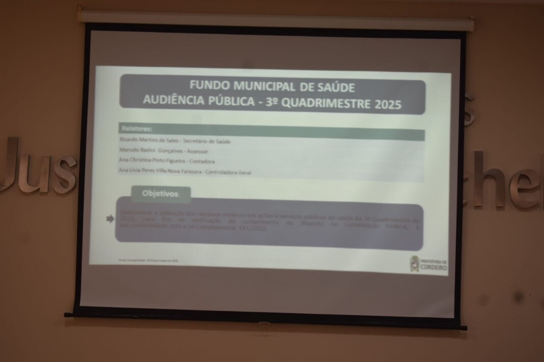 Em cumprimento à Lei de Responsabilidade Fiscal, a Prefeitura de Cordeiro promoveu, na terça-feira, 24 de fevereiro, na Câmara Municipal, a Audiência Pública para demonstração e avaliação das Metas Fiscais do Poder Executivo relativas ao Terceiro Quadrimestre de 2025, conforme estabelece o §4º do artigo 9º da Lei Complementar nº 101/2000.