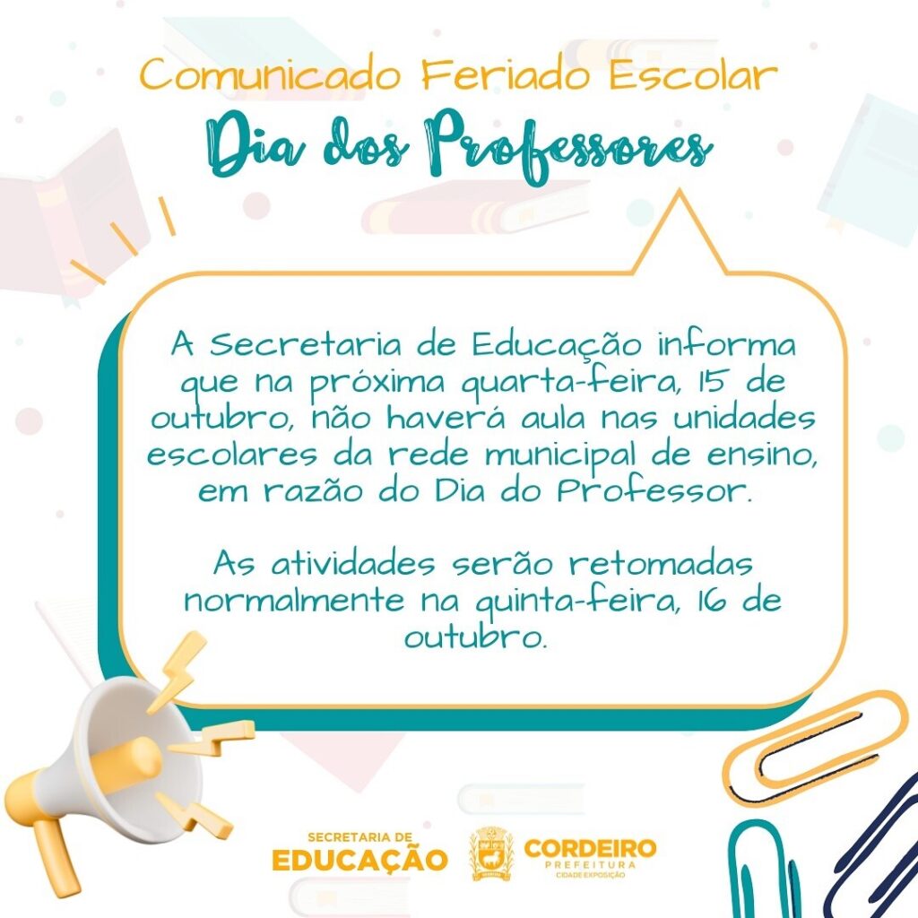 A Secretaria de Educação informa que na próxima quarta-feira, 15 de outubro, não haverá aula nas unidades escolares da rede municipal de ensino, em razão do Dia do Professor. As atividades serão retomadas normalmente na quinta-feira, 16 de outubro.