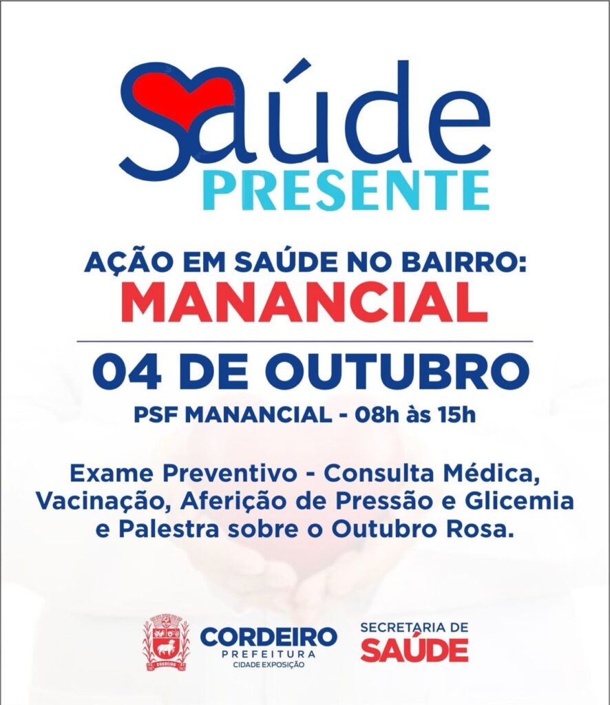 Ação em Saúde no Bairro Manancial – SAÚDE PRESENTE Local: PSF Manancial Dia: 04/10/25 Horário: 8h às 15h. Serviços oferecidos: Exame Preventivo Consulta Médica Atualização da caderneta de vacinação Aferição de pressão arterial Teste de glicemia Palestra sobre Outubro Rosa
