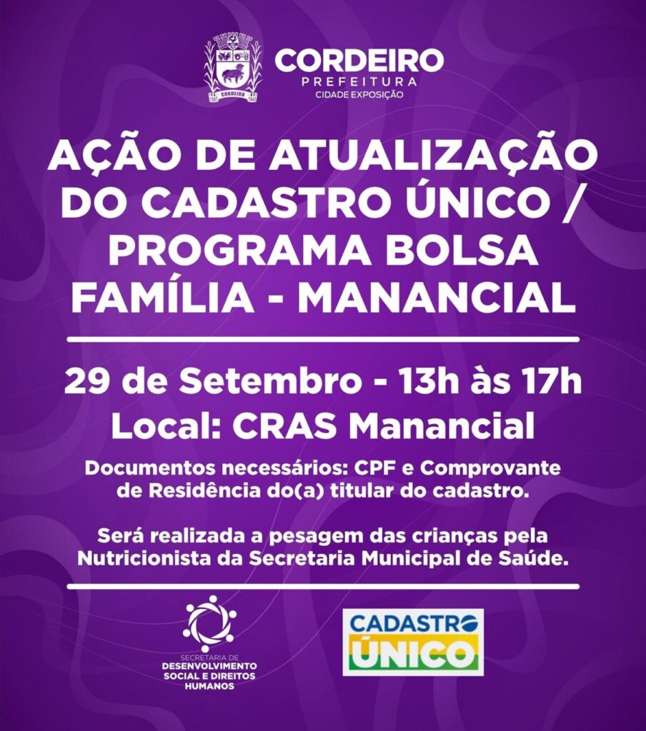 A Prefeitura de Cordeiro, por meio da Secretaria de Desenvolvimento Social e Direitos Humanos, realizará, na segunda-feira, 29 de setembro, das 13h às 17h, no CRAS Manancial, mais uma importante ação de atualização do Cadastro Único e do Programa Bolsa Família. Para a atualização, é necessário apresentar CPF e comprovante de residência do(a) titular do […]
