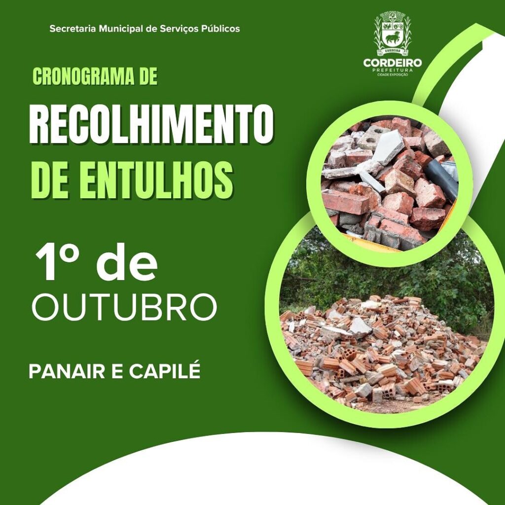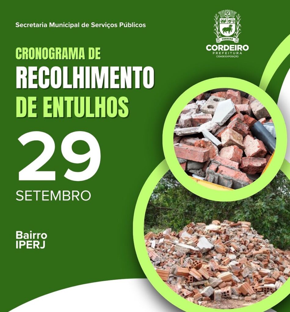 CRONOGRAMA DE RECOLHIMENTO DE ENTULHOS A Prefeitura de Cordeiro, através da Secretaria de Serviços Públicos, informa à população o cronograma para o recolhimento de entulhos. 29 de setembro Bairro Iperj Solicitamos a colaboração de todos para que os entulhos sejam organizados e dispostos nos locais apropriados com antecedência, garantindo a eficiência do serviço e contribuindo […]
