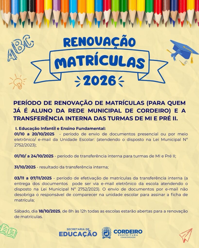 RENOVAÇÃO DE MATRÍCULAS PARA 2026 PERÍODO DE RENOVAÇÃO DE MATRÍCULAS (Para quem já é aluno da rede municipal de Cordeiro) e a transferência interna das turmas de MI e Pré II. I. Educação Infantil e Ensino Fundamental: 01/10 a 20/10/2025 – período de envio de documentos presencial ou por meio eletrônico/ e-mail da Unidade Escolar: […]