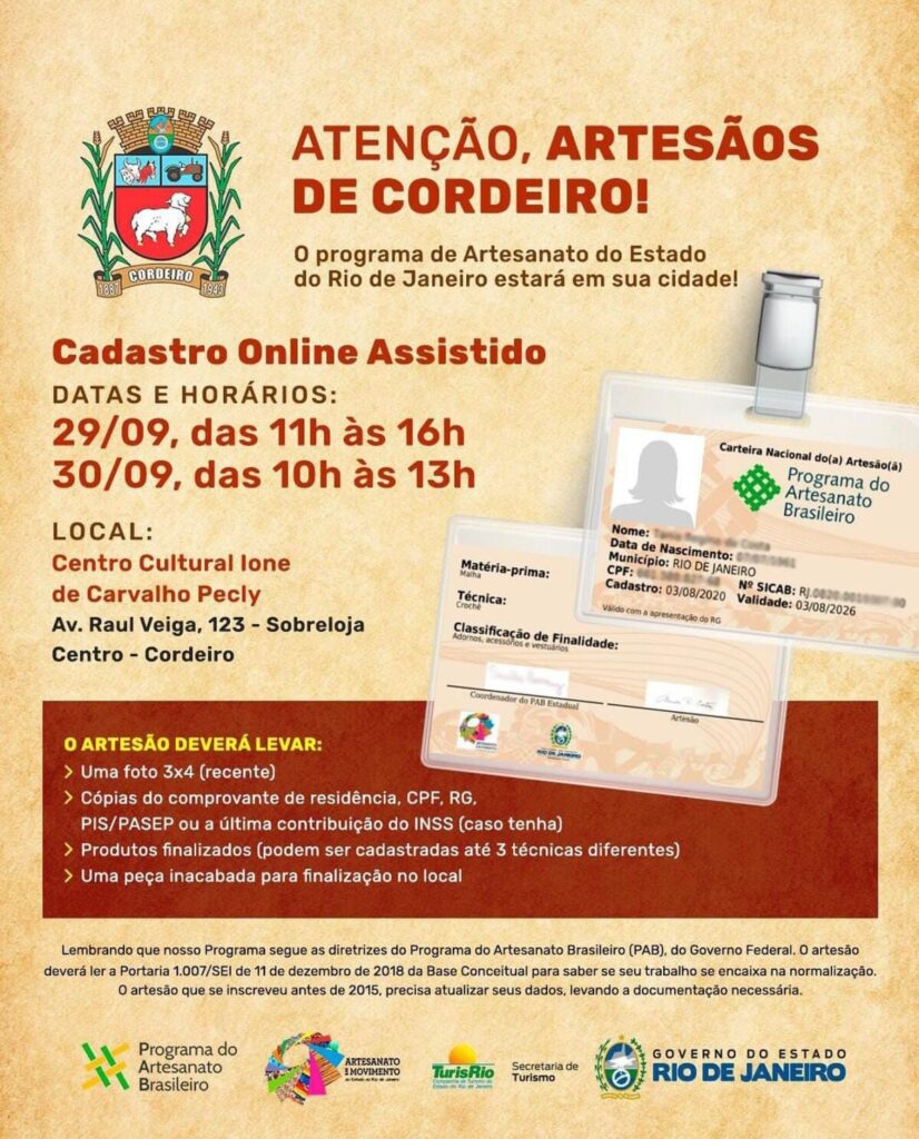 Programa de Artesanato do Estado do Rio de Janeiro estará em Cordeiro para realizar o Cadastro Online Assistido.