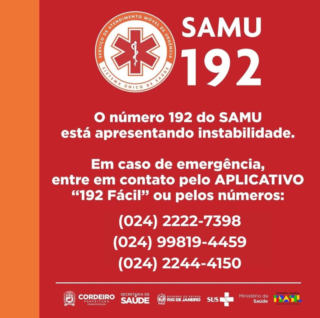 Atenção! O número 192 do SAMU está apresentando instabilidade. Em caso de emergência, entre em contato pelo aplicativo 192 Fácil ou pelos números: (024) 2222-7398 (024) 99819-4459 (024) 2244-4150