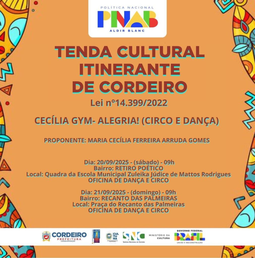 TENDA CULTURAL ITINERANTE DE CORDEIRO – Lei 14.399/2022 Cecília Gym – Alegria! (Circo e Dança) Proponente: Maria Cecília Ferreira Arruda Gomes Dia 20/09/2025 – sábado – 9h Bairro Retiro Poético Local: Quadra da Escola Municipal Zuleika Júdice de Mattos Rodrigues OFICINA DE DANÇA E CIRCO Dia 21/09/2025 – domingo – 9h Bairro Recanto das Palmeiras […]