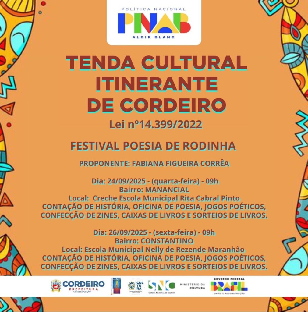 TENDA CULTURAL ITINERANTE DE CORDEIRO – Lei 14.399/2022 Festival Poesia de Rodinha Proponente: Fabiana Figueira Corrêa Dia: 24/09/2025 – (quarta-feira) – 09h Bairro: MANANCIAL Local: Creche Escola Municipal Rita Cabral Pinto CONTAÇÃO DE HISTÓRIA, OFICINA DE POESIA, JOGOS POÉTICOS, CONFECÇÃO DE ZINES, CAIXAS DE LIVROS E SORTEIOS DE LIVROS. Dia: 26/09/2025 – (sexta-feira) – 09h […]