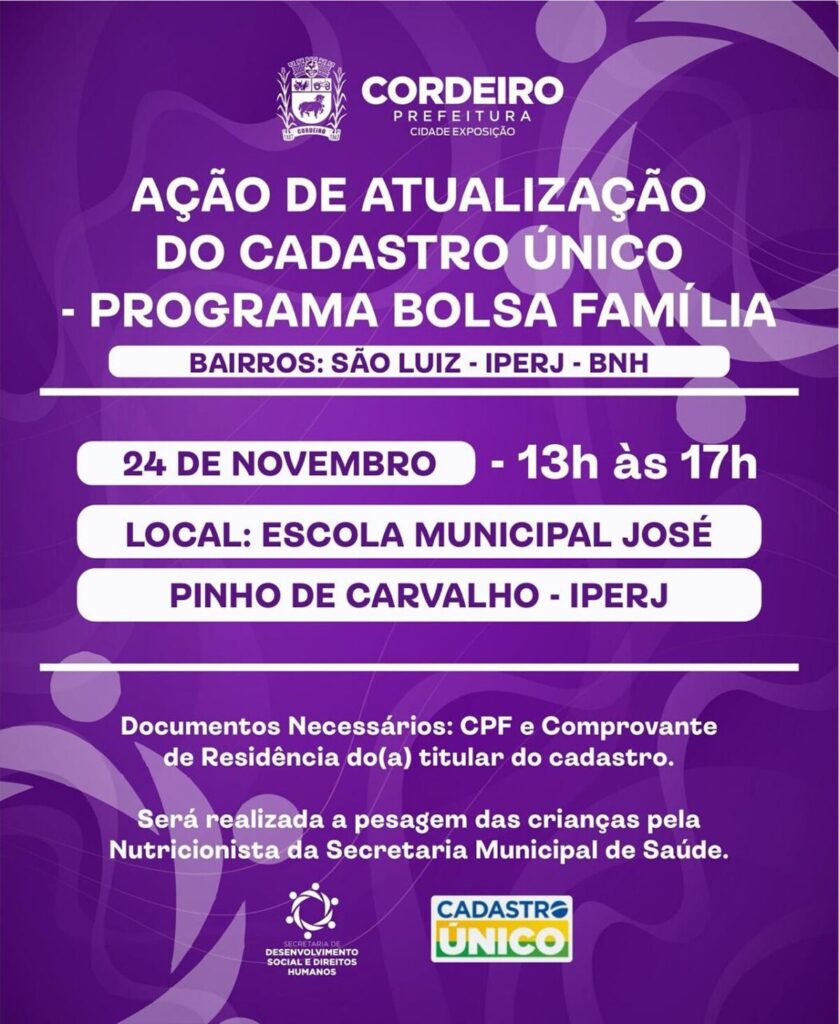 A Prefeitura de Cordeiro, por meio da Secretaria de Desenvolvimento Social e Direitos Humanos, realizará, na segunda-feira, 24 de novembro, das 13h às 17h, na Escola Municipal José Pinho de Carvalho, mais uma importante ação de atualização do Cadastro Único e do Programa Bolsa Família. Para a atualização, é necessário apresentar CPF e comprovante de […]