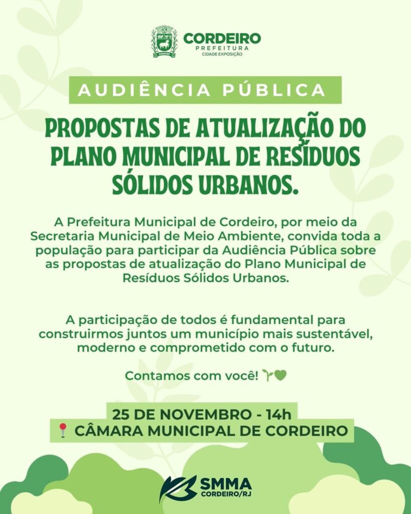 A Prefeitura Municipal de Cordeiro, por meio da Secretaria Municipal de Meio Ambiente, convida toda a população para participar da Audiência Pública sobre as propostas de atualização do Plano Municipal de Resíduos Sólidos Urbanos. Data: 25/11/25 Local: Câmara Municipal de Cordeiro Horário: 14h A participação de todos é fundamental para construirmos juntos um município mais […]