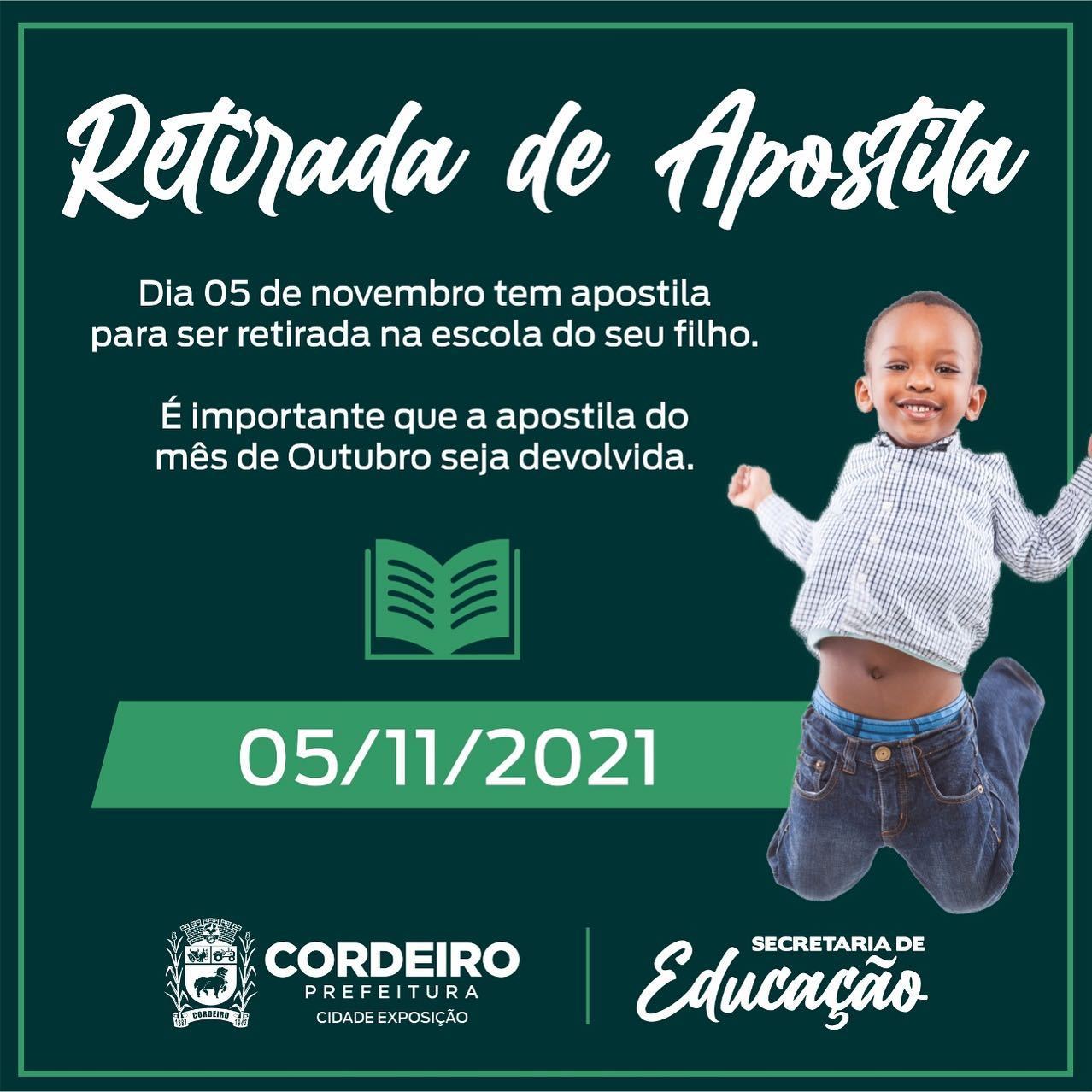 Dia 05 de novembro tem apostila para ser retirada na escola do seu filho. É importante que a apostila do mês de outubro seja devolvida.