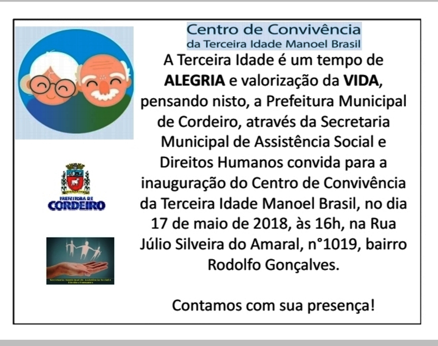 CENTRO DE CONVIVÊNCIA DA TERCEIRA IDADE MANOEL BRASIL CONVITE SECRETARIA DE ASSISTÊNCIA SOCIAL E DIREITOS HUMANOS DE CORDEIRO