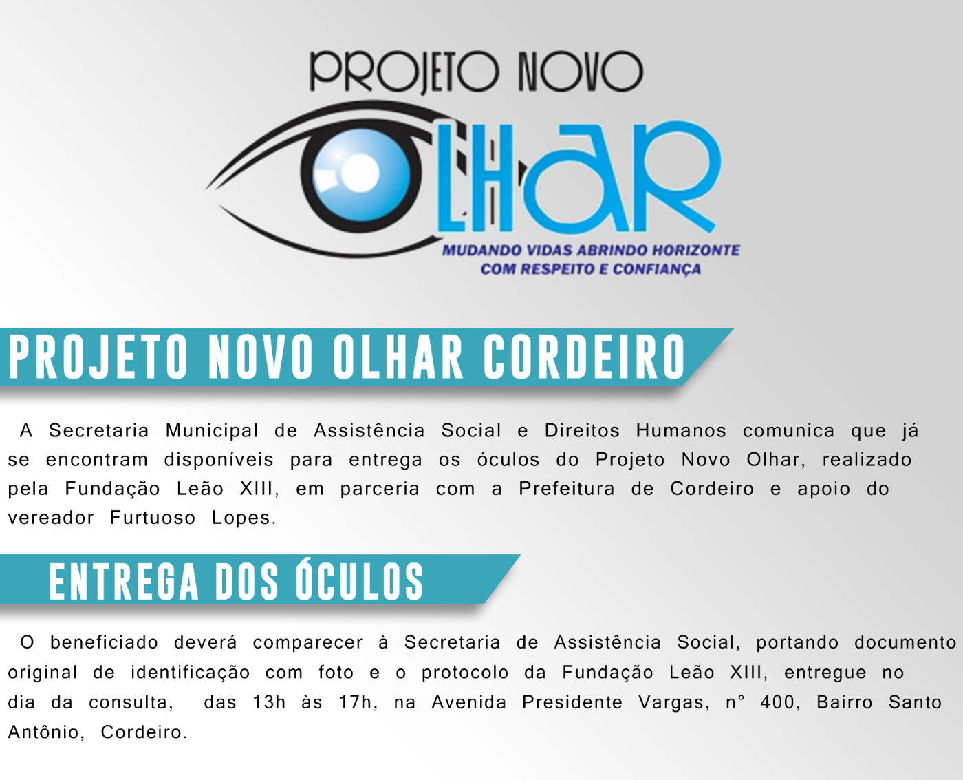 PROJETO NOVO OLHAR ENTREGA DE ÓCULOS SECRETARIA DE ASSISTÊNCIA SOCIAL E DIREITOS HUMANOS FUNDAÇÃO LEÃO XIII PREFEITURA DE CORDEIRO