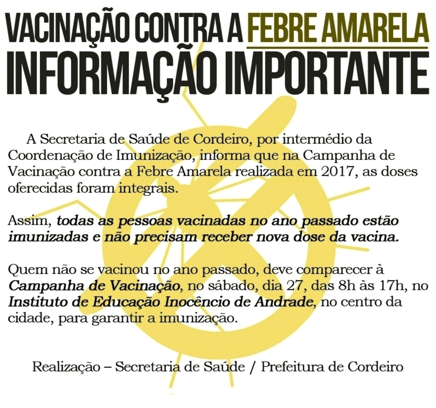 CAMPANHA DE VACINAÇÃO / FEBRE AMARELA INFORMAÇÃO IMPORTANTE DA SECRETARIA DE SAÚDE