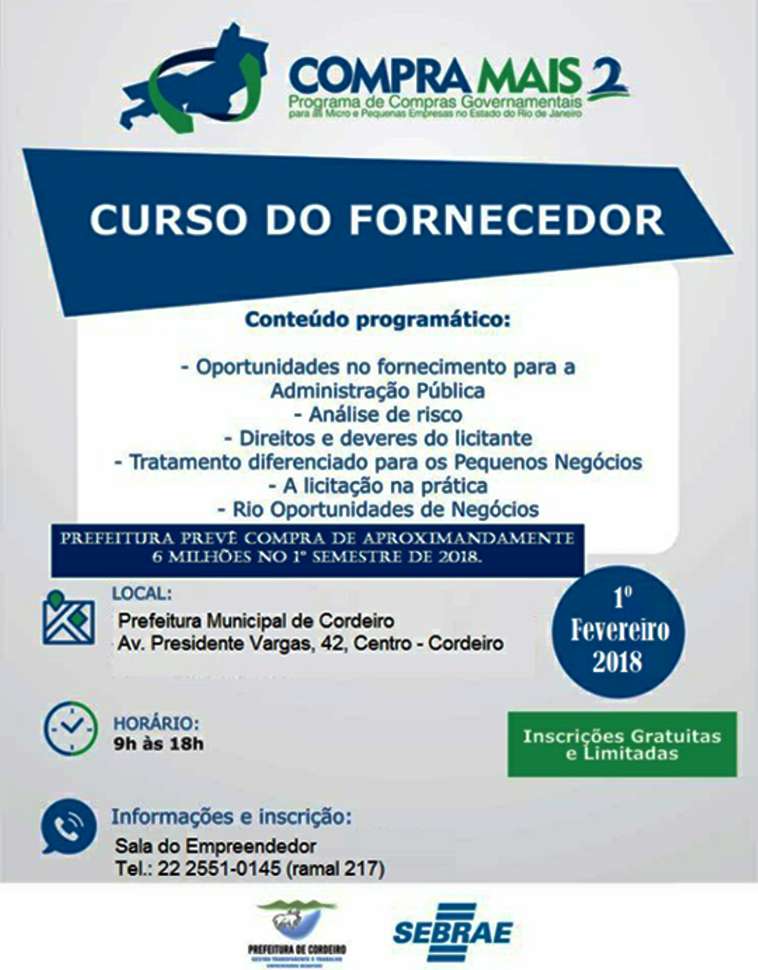 Nova oportunidade para os empreendedores cordeirenses Vem aí o Curso do Fornecedor, numa parceria entre SEBRAE e Prefeitura IMPRENSA CORDEIRO – CIDADE EXPOSIÇÃO Com o início do ano, surgem também as novas iniciativas da Secretaria… Nova oportunidade para os empreendedores cordeirenses