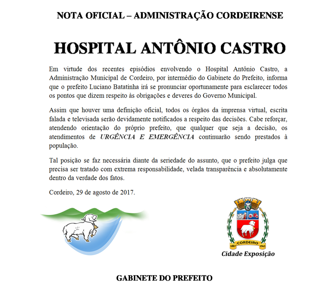 NOTA OFICIAL PRELIMINAR TEMA – ‘HOSPITAL ANTÔNIO CASTRO’ O Gabinete do Prefeito divulga, por meio do cartaz em anexo, NOTA OFICIAL PRELIMINAR da Administração Municipal de Cordeiro a respeito dos acontecimentos envolvendo o Hospital Antônio… NOTA OFICIAL PRELIMINAR
