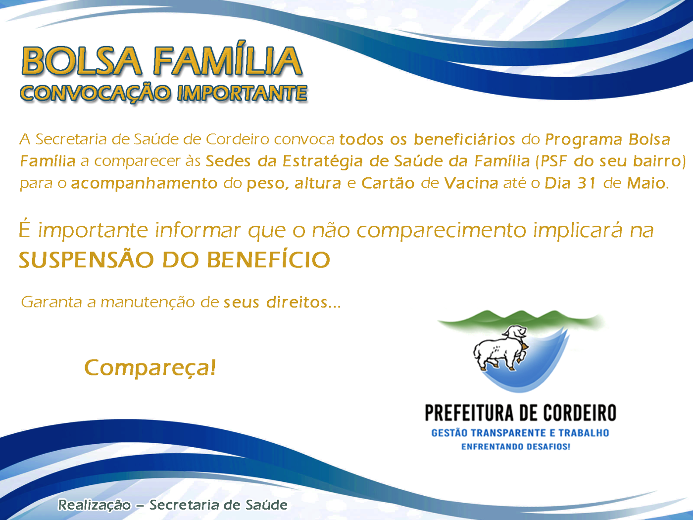 BOLSA FAMÍLIA – CONVOCAÇÃO IMPORTANTE A Secretaria de Saúde de Cordeiro convoca todos os beneficiários do Programa Bolsa Família a comparecer às sedes da Estratégia de Saúde da Família (PSF do seu bairro) para o… BOLSA FAMÍLIA