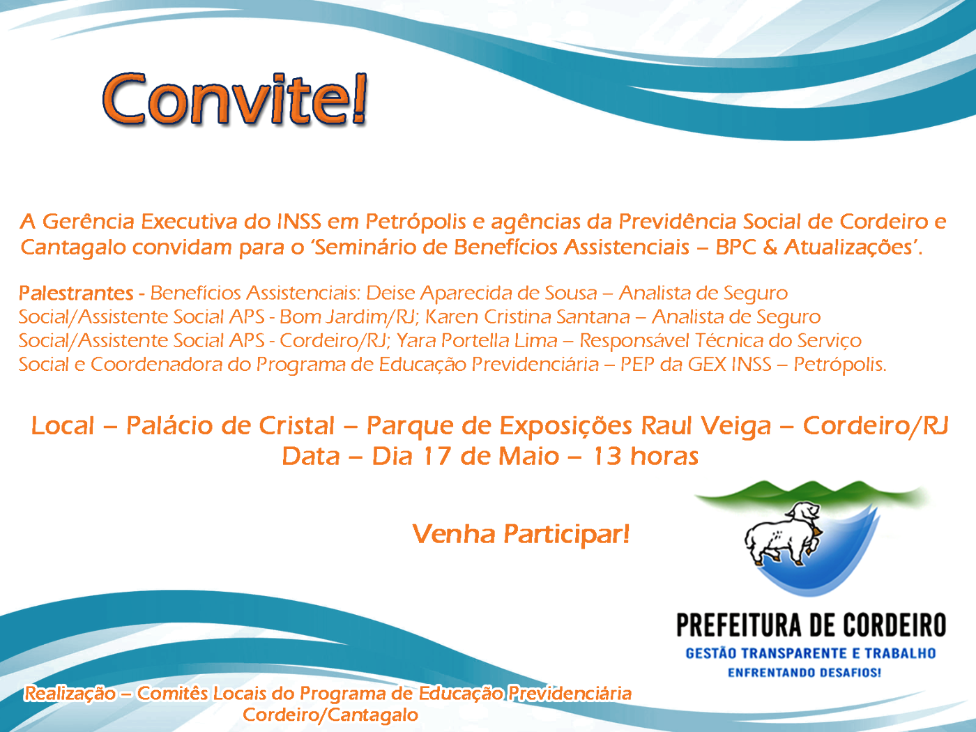 CONVITE A Gerência Executiva do INSS em Petrópolis e agências da Previdência Social de Cordeiro e Cantagalo convidam para o ‘Seminário de Benefícios Assistenciais – BPC & Atualizações’. Palestrantes – Benefícios Assistenciais: Deise Aparecida de… CONVITE EVENTO PREVID