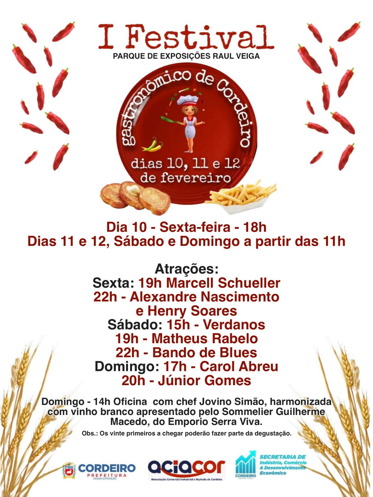 Vem aí o Primeiro Festival Gastronômico de Cordeiro, uma parceria da Prefeitura de Cordeiro com a Aciacor. O evento acontecerá nos dias 10, 11 e 12 de fevereiro no Parque de Exposições Raul Veiga. Em… I Festival Gastronômico