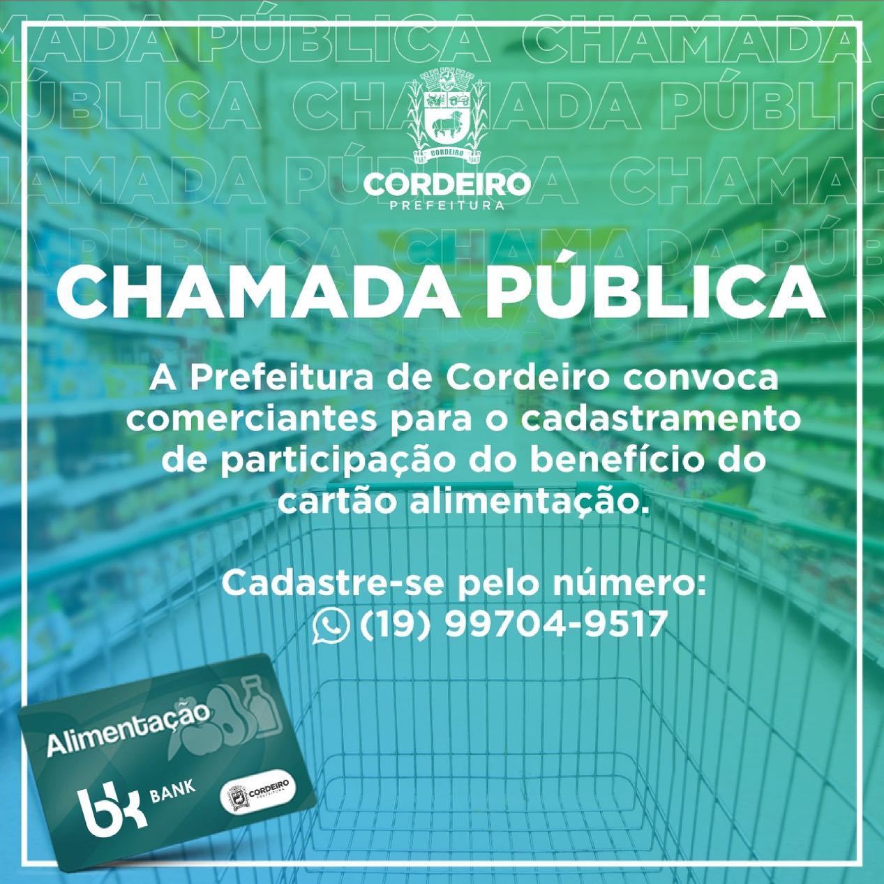 A Prefeitura de Cordeiro convoca comerciantes para o cadastramento de participação do benefício de cartão alimentação. Cadastre-se pelo número: (19) 99704-9517
