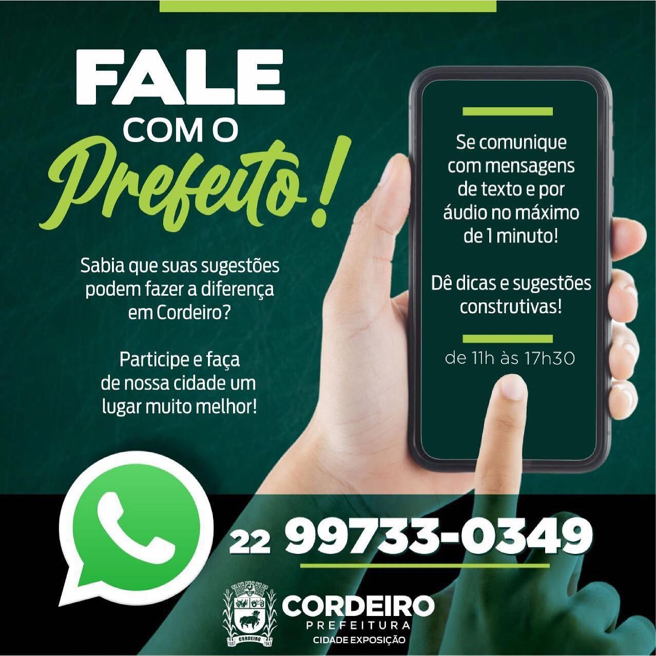 Não existe um governo sem a participação da população na construção de uma cidade melhor, pois só com a sua ajuda é que podemos saber o que anda acontecendo em todos os bairros da cidade,… Fale com o Prefeito!