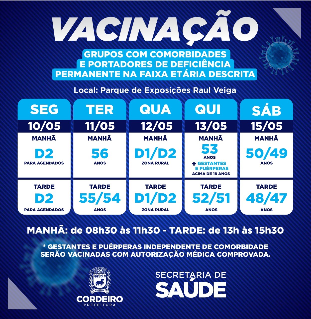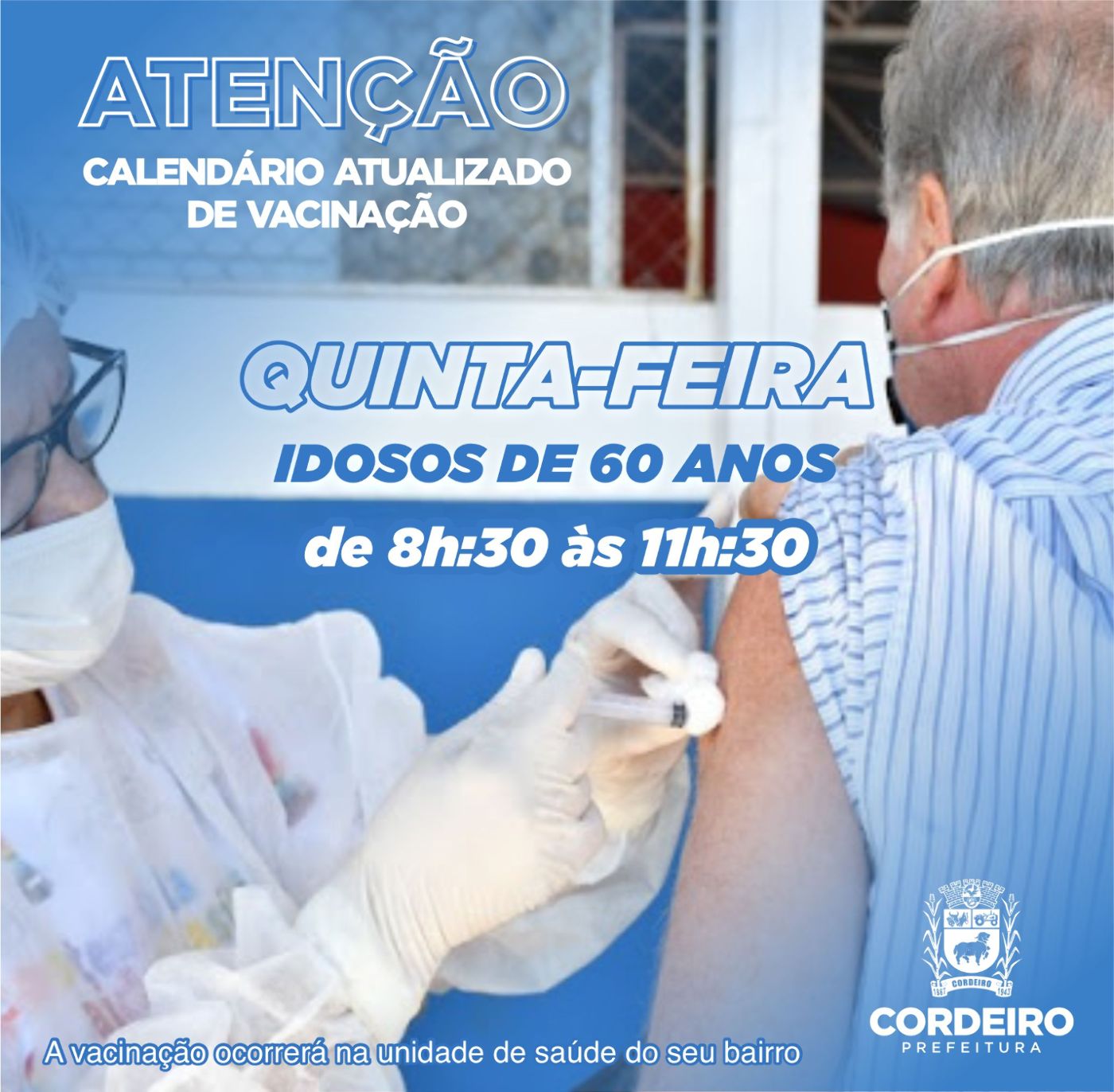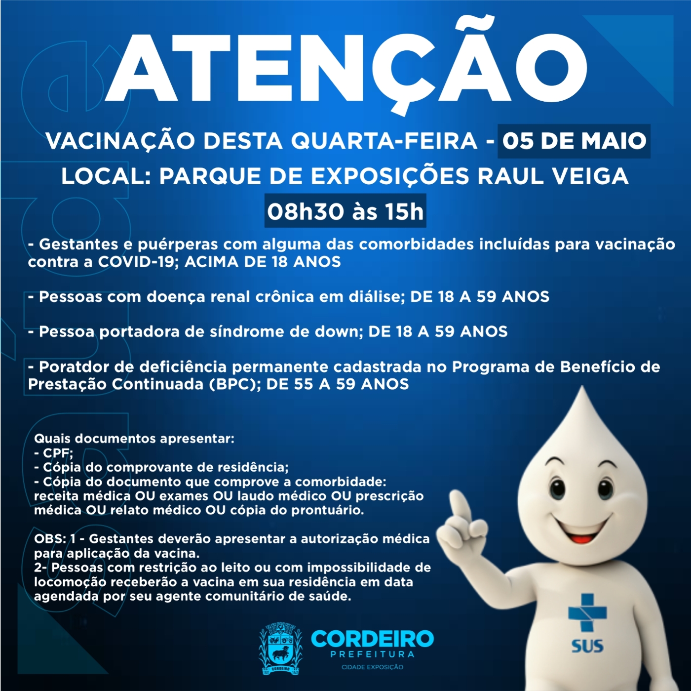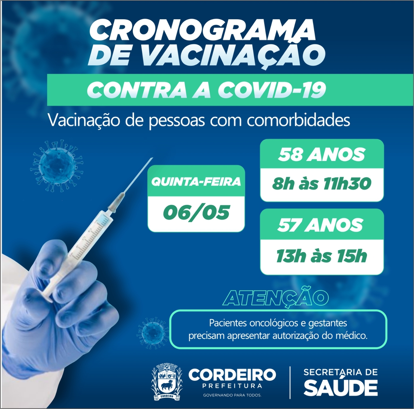 ATENÇÃO!!! Se você tem 59 anos de idade, e é portador de alguma das comorbidades abaixo: – Diabetes mellitus; – pneumopatias graves: doença pulmonar obstrutiva crônica (DPOC), fibrose cística, fibroses pulmonares, pneumoconiose, displasia broncopulmonar e… ATENÇÃO!!! Se você tem 59 anos de idade