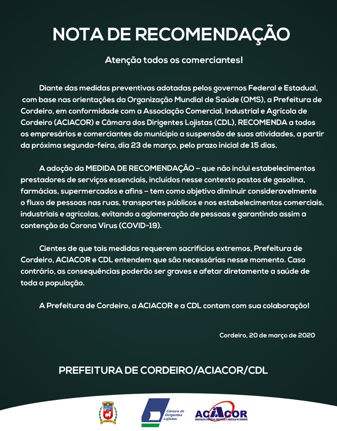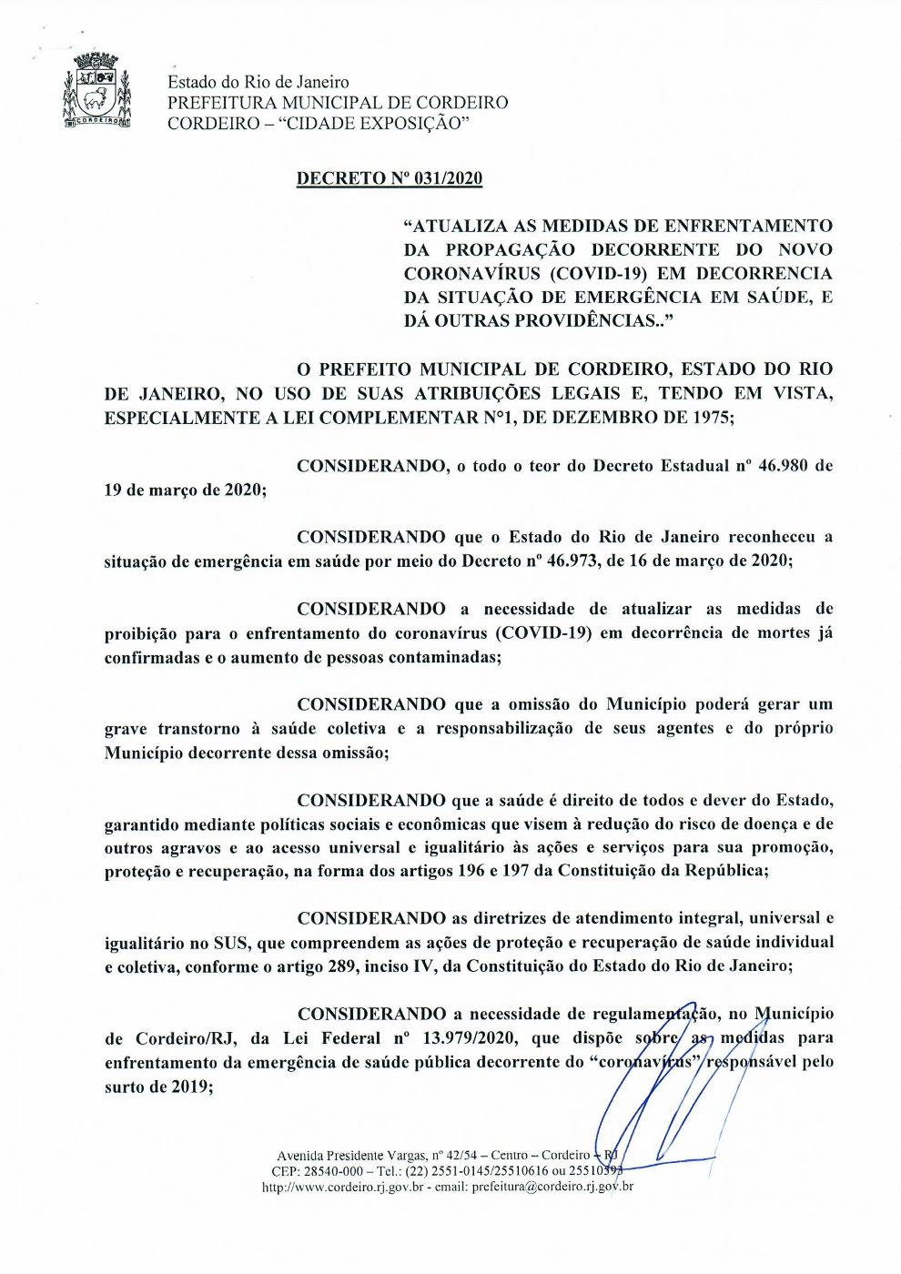 CORONA VÍRUS / DECRETO 031/2020 PREFEITURA DE CORDEIRO Novas medidas temporárias de prevenção ao contágio e enfrentamento de emergência em saúde pública de importância internacional, decorrentes do Corona Vírus (COVID-19).
