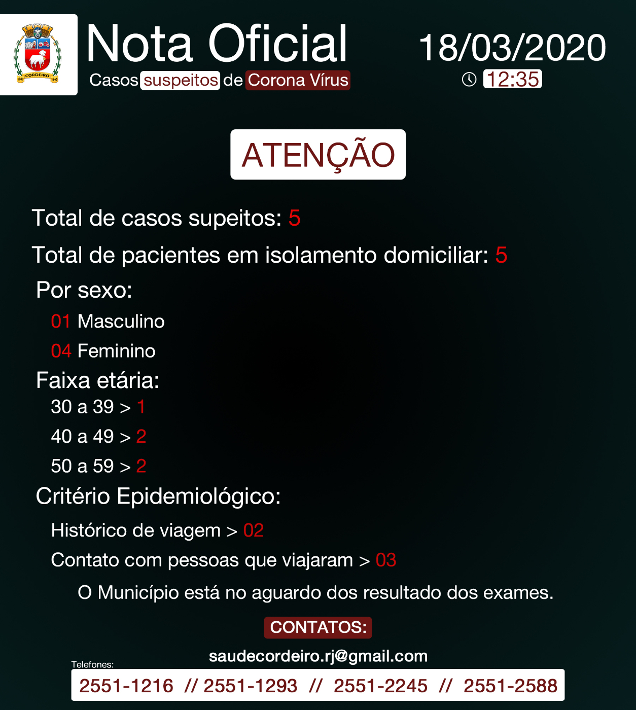 NOTA OFICIAL CORONA VÍRUS / CASOS SUSPEITOS SECRETARIA DE SAÚDE DE CORDEIRO