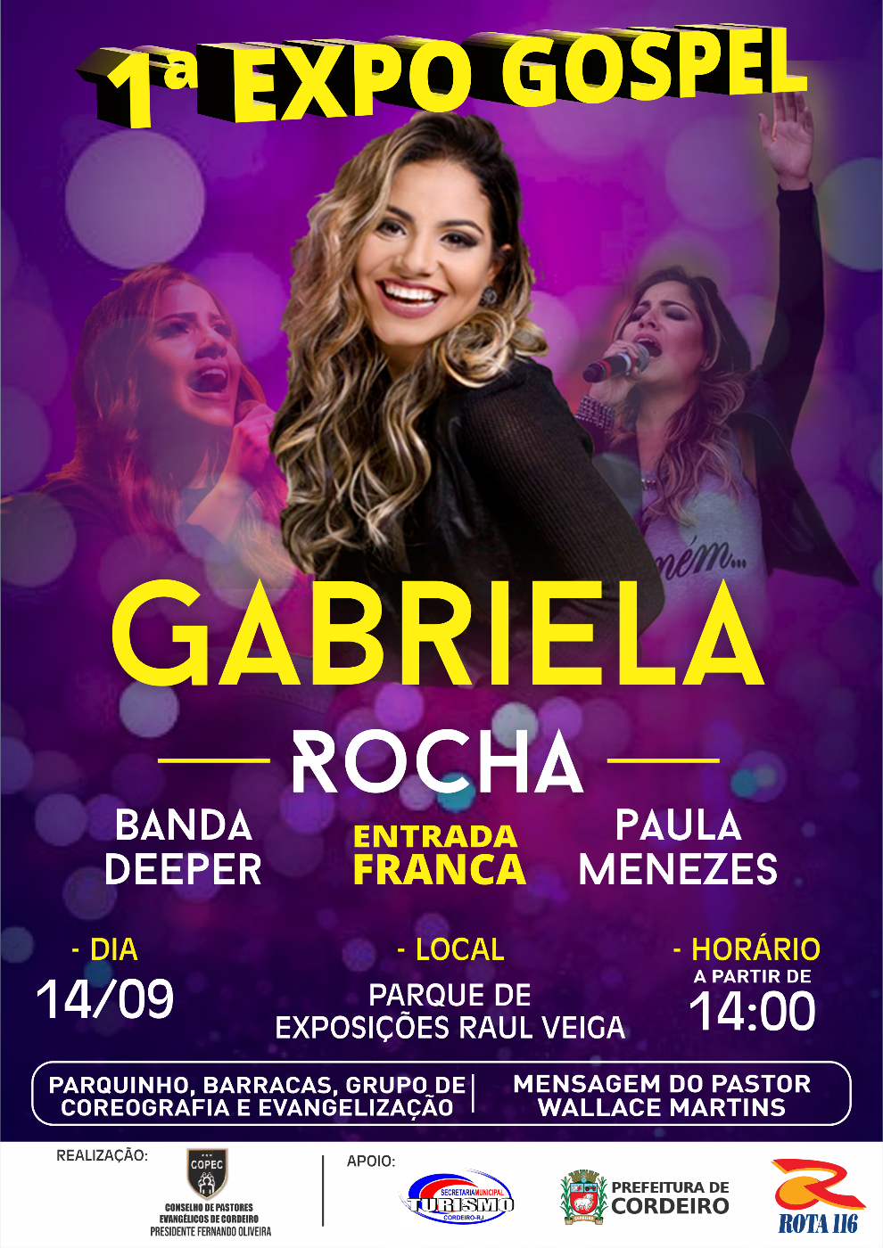 Gabriela Rocha é a atração principal da 1ª Expo Gospel de Cordeiro Show da renomada cantora acontece na noite do próximo sábado IMPRENSA CORDEIRO – CIDADE EXPOSIÇÃO No próximo sábado, dia 14, a comunidade evangélica… Gabriela Rocha é a atração principal da 1ª Expo Gospel de Cordeiro