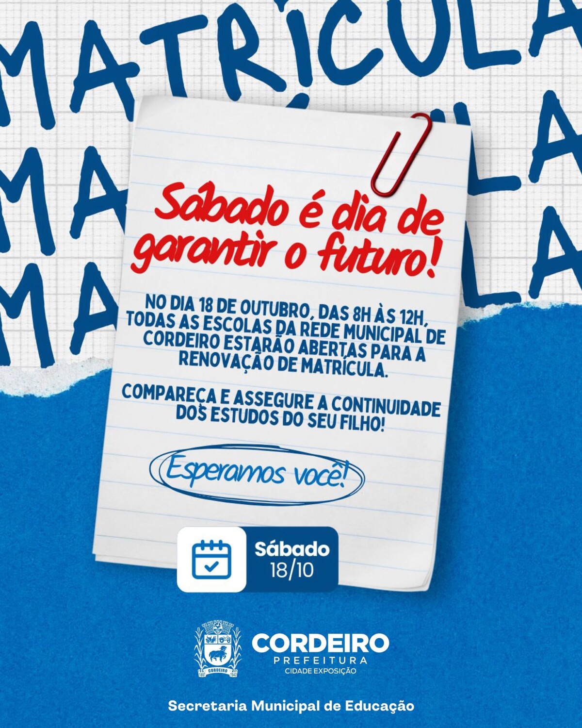 No dia 18 de outubro, as escolas da rede municipal estarão abertas para a renovação de matrícula.