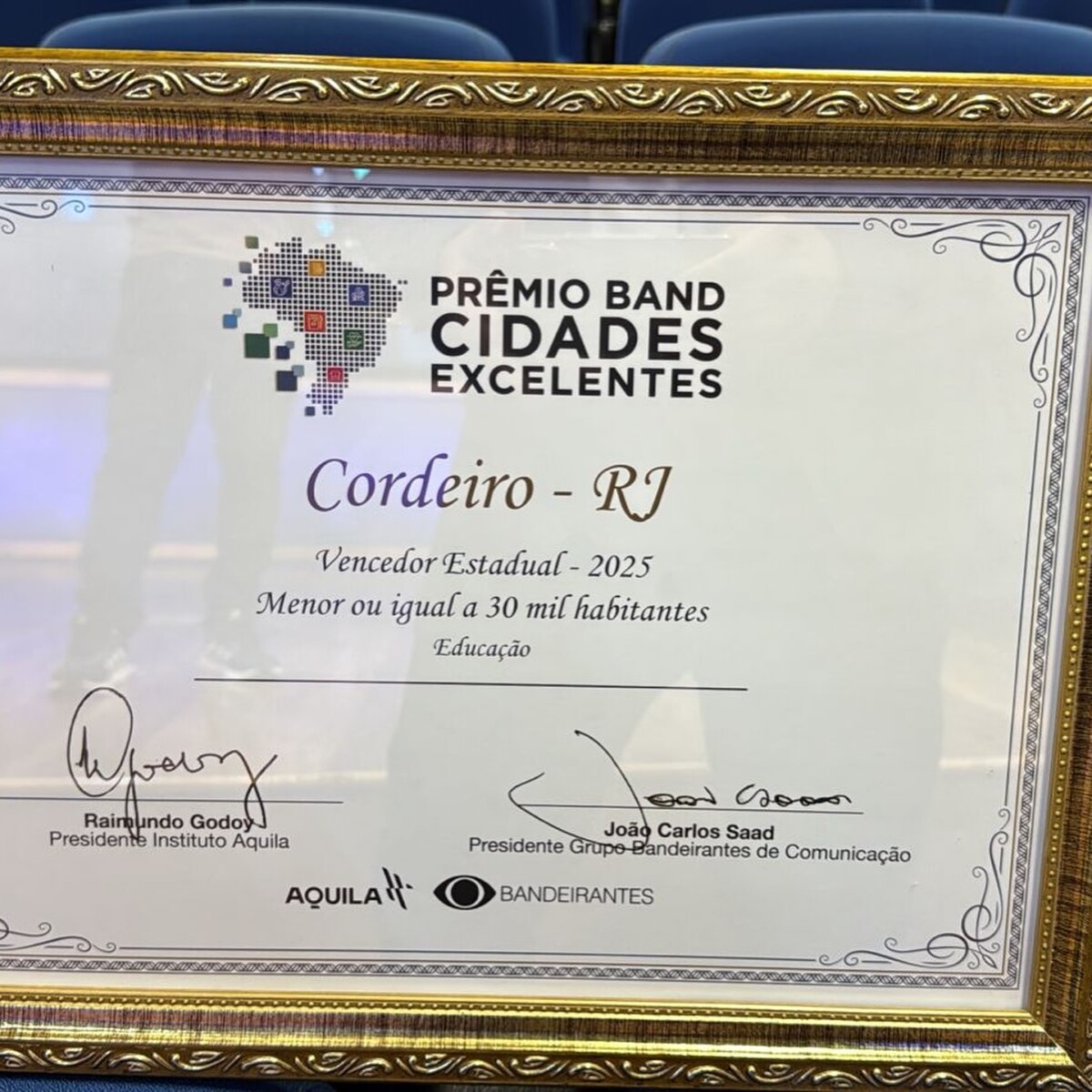Cordeiro é vencedor da etapa estadual do Prêmio Band Cidades Excelentes 2025, no eixo Educação, entre os municípios com até 30 mil habitantes.