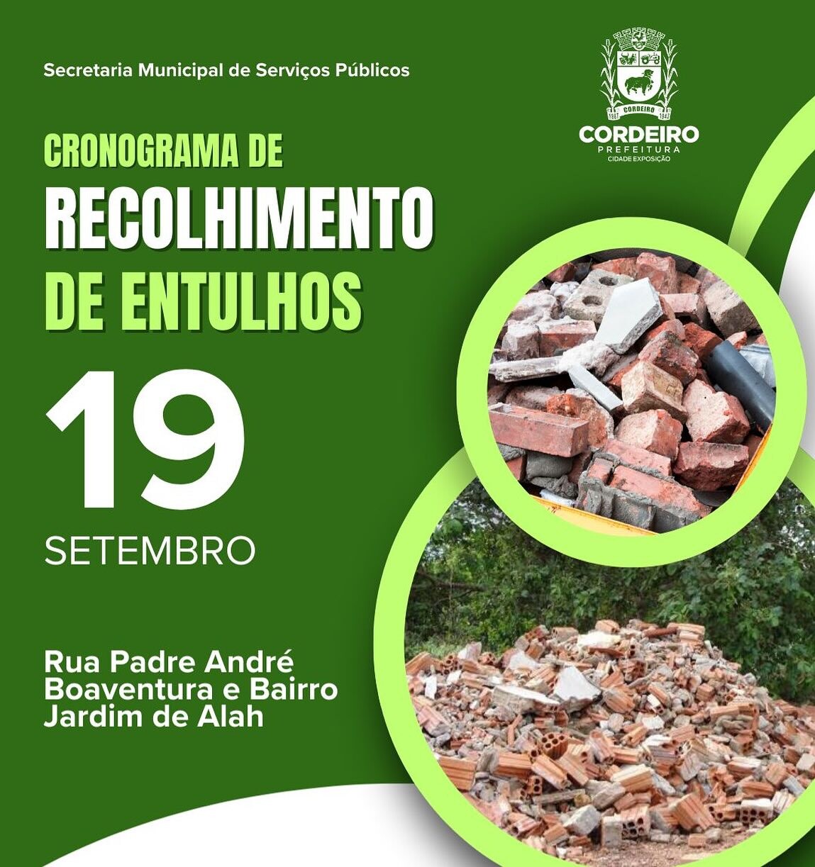 A Prefeitura de Cordeiro, através da Secretaria de Serviços Públicos, informa à população o cronograma para o recolhimento de entulhos.