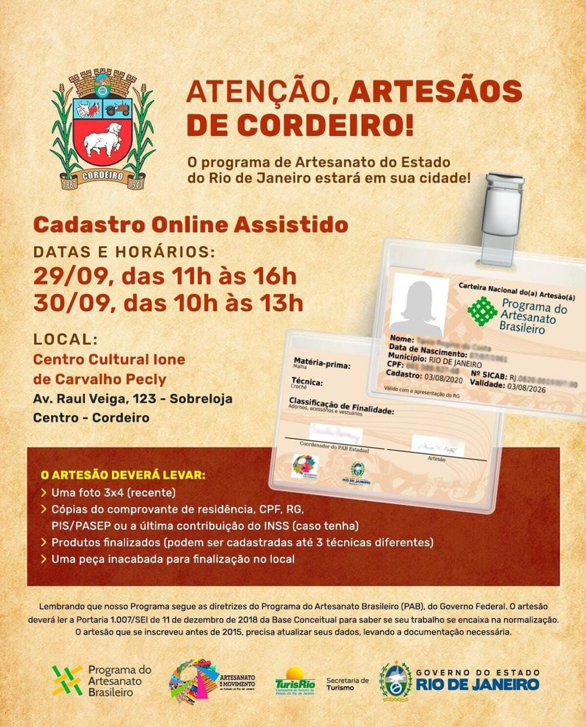 O Programa de Artesanato do Estado do Rio de Janeiro estará em nossa cidade para realizar o Cadastro Online Assistido. Essa é uma oportunidade importante para os artesãos regularizarem sua situação e garantirem os benefícios da Carteira Nacional do Artesão.