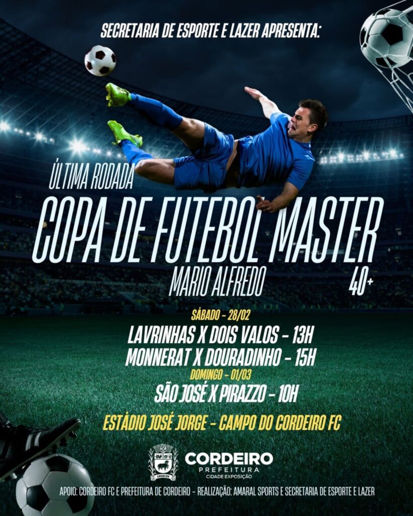 A Secretaria Municipal de Esporte e Lazer apresenta a última rodada da Copa Mário Alfredo de Futebol Master 40+, que será realizada neste fim de semana no Estádio José Jorge, campo do Cordeiro Futebol Clube.
